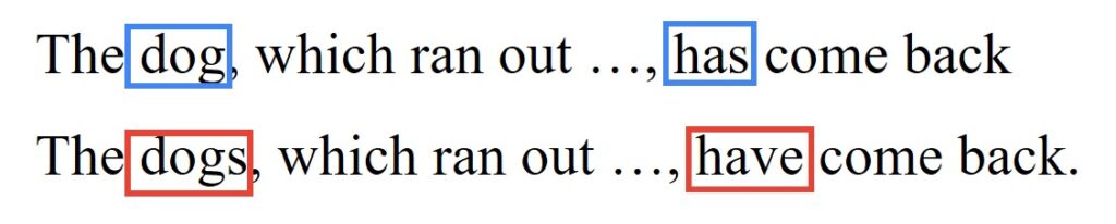 If you carefully observe the two sentences above, you will notice how the word “Dog” at the very beginning of the sentence influences the word “has” which is at the very end. If we change the singular word to a plural word “Dogs”, there is a direct effect on the word “have” which is very far from the influencer word “Dogs”.