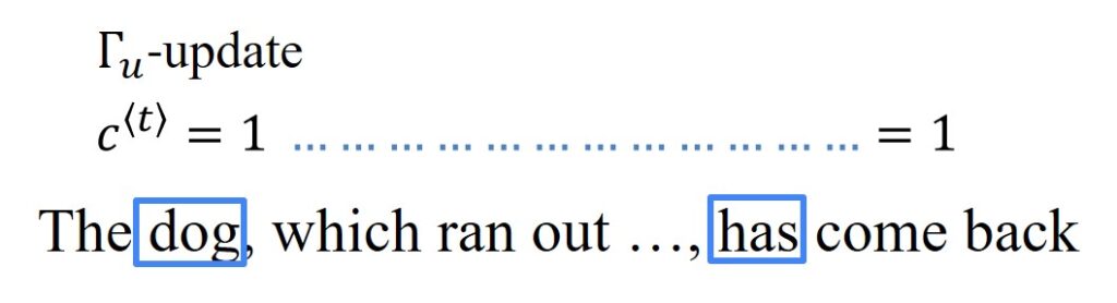 When the GRU propagates further through the sentence, it keeps updating the gate value to zero. This essentially means that for the words between “dog” and “has”, the gate value will be zero and thus, the memory cell will keep holding on to its previous value. Because if \(\Gamma _{u}= 0 \), then, \(1- \Gamma _{u}= 1 \). Thus, \(c^{\left \langle t \right \rangle} \) will just be equal to the previous value \(c^{\left \langle t-1 \right \rangle} \). This way, throughout the sentence, GRU remembers that “The dog” is singular in nature.