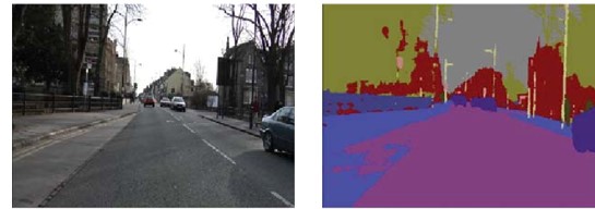 On the left side, we can see the image of the road and on the right, we can see segmented image into several areas – road area, sidewalk area, pedestrian area, tree area, building area, and sky area. Each region is painted in different colors. From this example, it is easy to understand why image segmentation is much more accurate than simple object detection. By using the object detection, we are detecting a set of bounding boxes that correspones to each object in the image. However, to obtain any information about the shape of that object we need a different approach. As you can see, the image segmentation creates a pixel-wise mask for each object of interest in the image that provides us more information about that object.