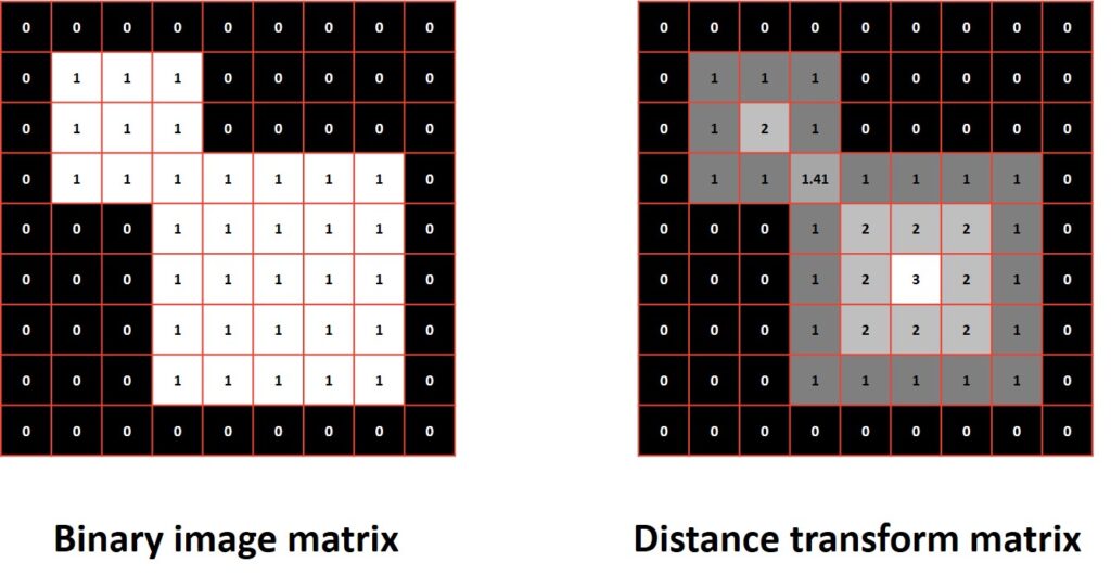 As you can see in the image above every pixel with a value of zero (black pixel) also has a distance transform value of 0, as it is the closest zero-valued pixel to itself. On the other hand, the distance transform of the pixels with the value of 1 is given by the following formula: