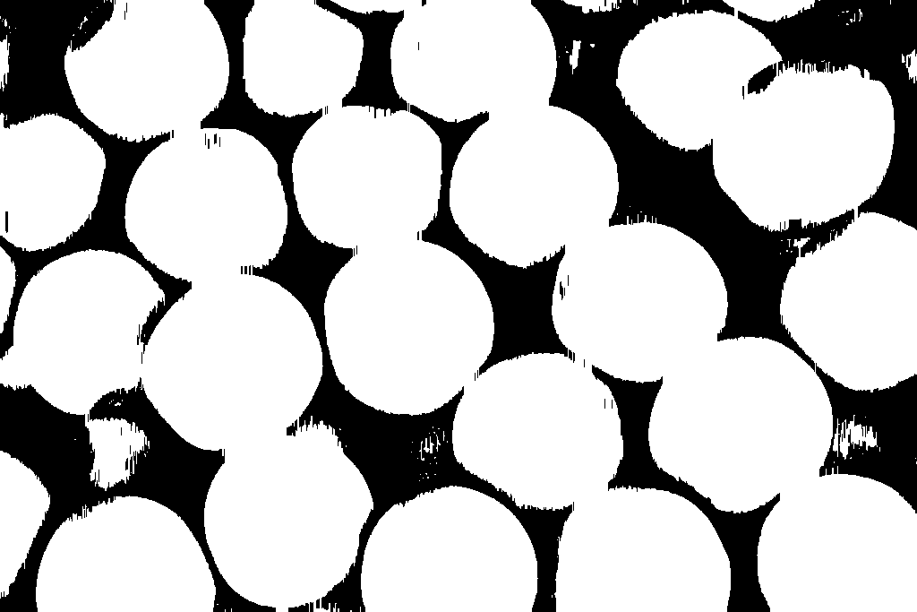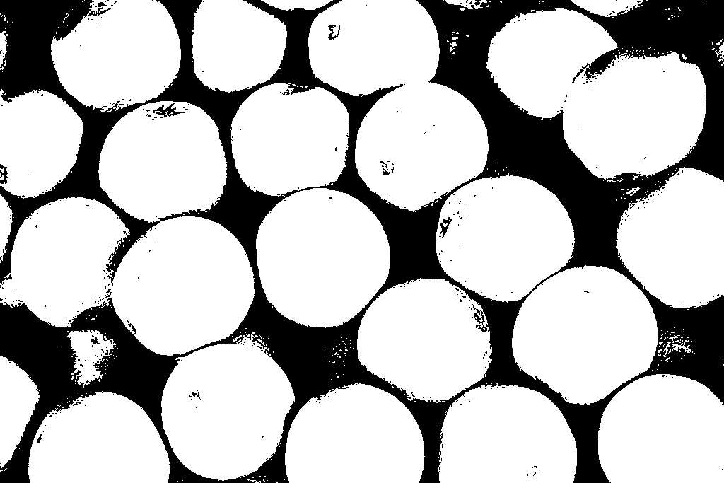 As you can see we have achieved our goal and removed small black dots from white areas. However, notice that the shapes of some oranges are a little distorted. Since we don’t want to affect the overall shapes of the objects we will apply closing operation (dilation followed by erosion).