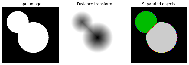 As you can see we have detected the watershed line right in the middle of the two overlapping circles. It is important to remember that the function skimage.segmentation.watershed()will automatically paint objects that we want to segment with different colors whereas the background area will have a value of zero.