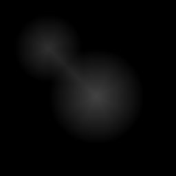 Now we need to somehow separate these two touching objects and create a border between them. The idea is to create a border as far as possible from the centers of the overlapping objects. For this, we will use the method that works very well on rounded objects and it is called a distance transform. It is an operator that generally takes binary images as inputs and pixel intensities of the points inside the foreground regions are replaced by their distance to the nearest pixel with zero intensity (background pixel).