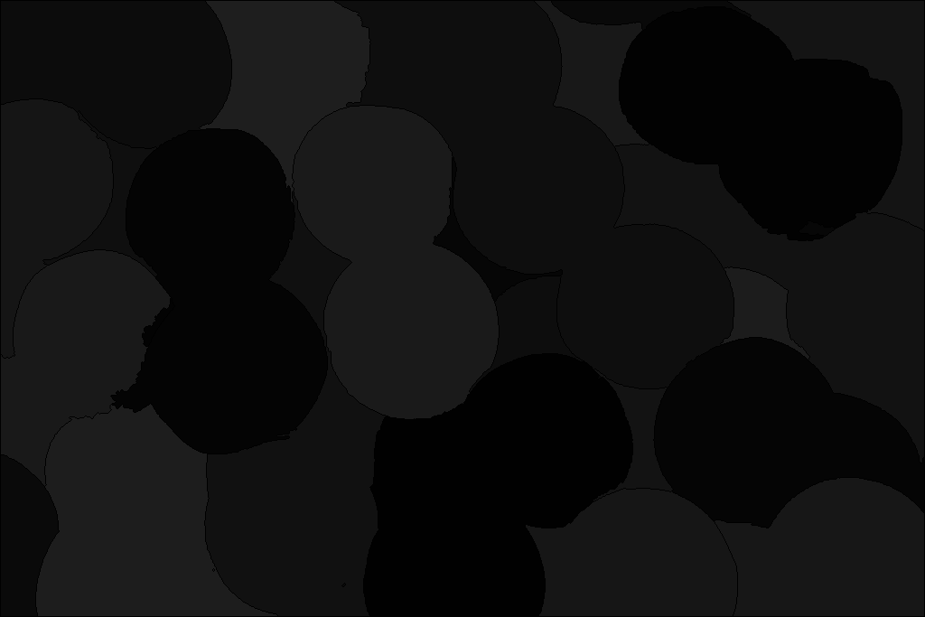 The final step is to apply the skimage.segmentation.watershed()function from the Scikit-image library. As parameters, we need to pass our inverted distance transform image and the markers that we calculated in the previous line of code. Since the watershed algorithm assumes our markers represent local minima we need to invert our distance transform image. In that way, light pixels will represent high elevations, while dark pixels will represent the low elevations for the watershed transform.