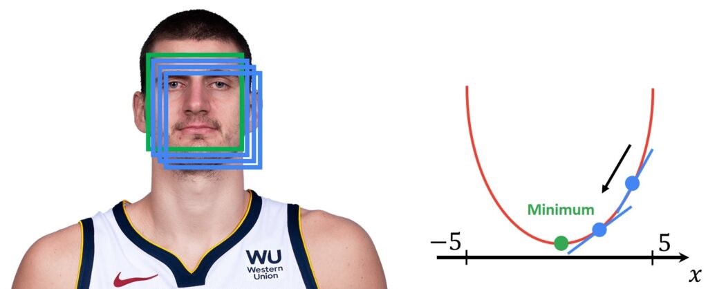 Another very popular search strategy is Gradient descent. First, we choose a similarity function, that is differentiable with respect to the tracking parameters and has a smooth and convex landscape around the best match. Then, we can use gradient-based techniques and find the optimal parameters of the transformation (motion) model.