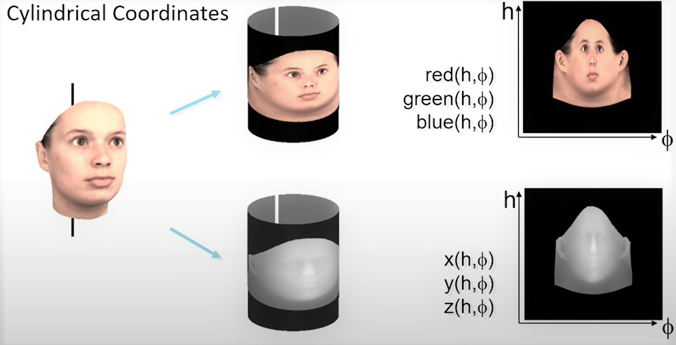 Initially, the heads of 200 young people were scanned. From this number, 100 were male and 100 were female. The output of this scanner was a head data structure in a cylindrical representation. This provides coordinates \(r(h, \phi) \) that tell us how faces are sampled. The \(h \) angle is the horizontal spacing, where the vertices are located in the x direction, and the \(\phi\) in the y, or vertical direction. Additionally to these angles, we get RGB colors of the points on the face.