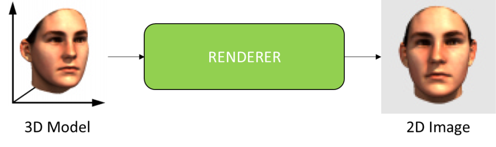 We can think of \(I_{model}(x, y)\) as an image that is projected on an image plane. We get this by rendering. Rendering means that there is some algorithm that from a large set of parameters gives us an image. This simply means that we go from a 3D image, that has \((X, Y, Z)\) coordinates of each of the vertices and the corresponding texture for each vertice, to a 2D image (Figure 11).