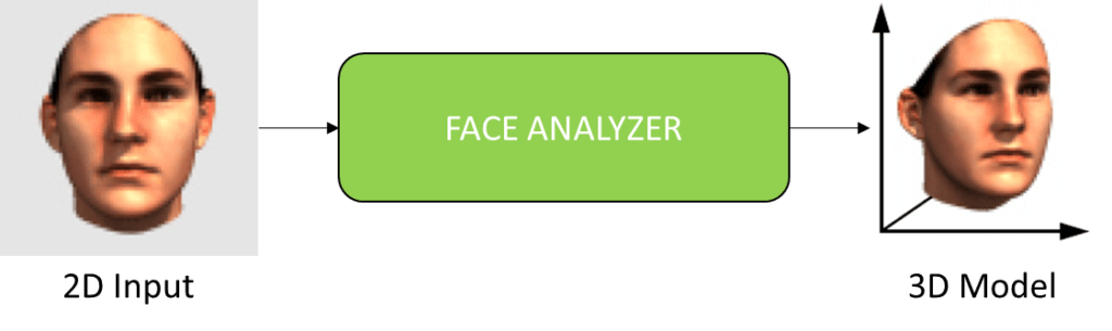 A 2D input image is taken and placed in something the researchers call Face Analyzer. The goal of this analyzer is to return a 3D mesh of the face. Interestingly, if we were to take this 3D mesh and project it back onto the image plane it should create the same or a very similar image as the one that we started with.