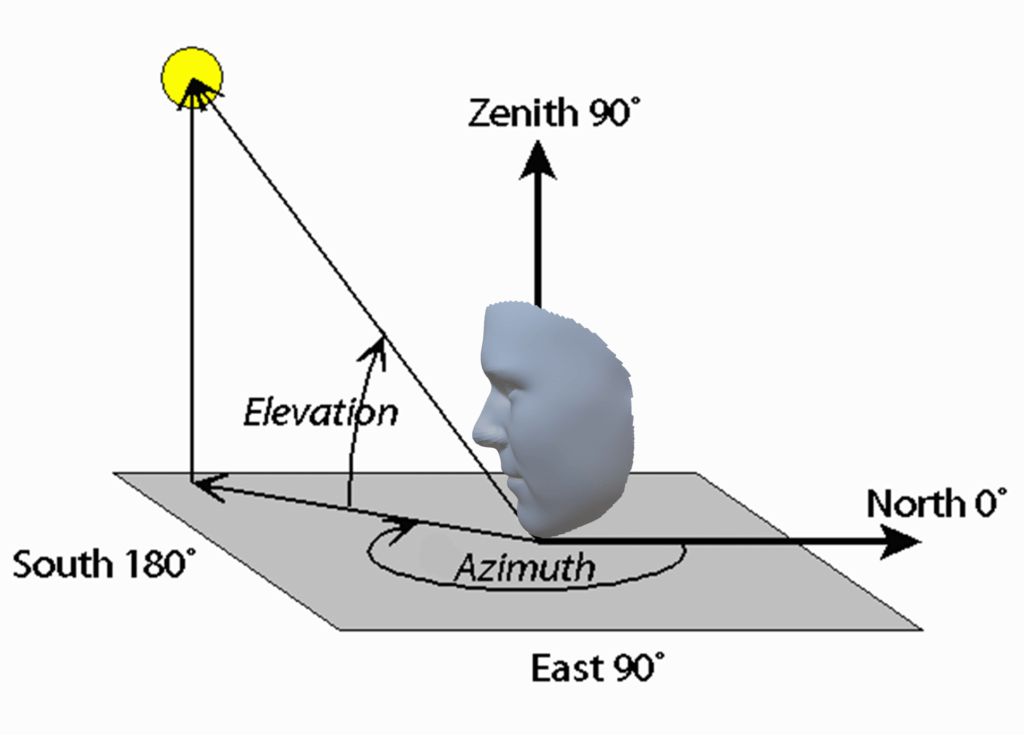 Now we come to an interesting part, how we can match a 3D model to our faces. So, we want to automatically match a 3D model to one or more images. The goal is to find the coefficients of a 3D model for a particular image. Applying PCA to a face we obtain two coefficients, \(\alpha_j\) and \(\beta_j\), which are facial shape and texture. On the other hand, there is a large number of parameters that are needed for further rendering processes. These parameters are defined as \(\overrightarrow{\rho}\), and they include camera position (azimuth and elevation, Figure 10), object scale, image plane rotation, and translation, the intensity of ambient light, and intensity of directed light.