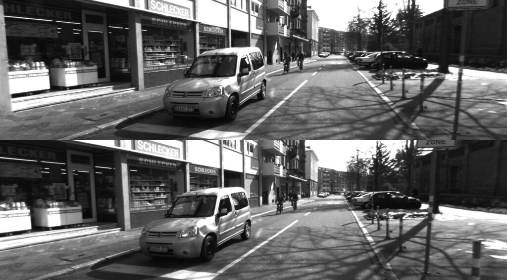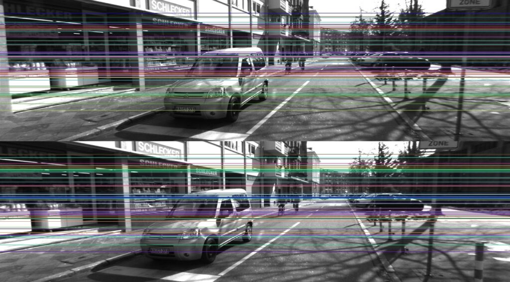 In the last example, we had an image where epipolar lines are converging to an epipole. However, if we have a perfect stereo system (cameras are only translated, whereas there was no rotation), we will have epipolar lines that are parallel to each other. Let’s see this example.